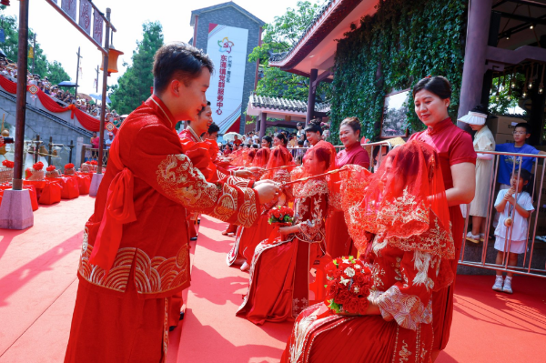 活动现场,10对新人在此起彼伏的掌声、喝彩声和祝福声中,完成了系列喜庆浪漫的非遗婚俗仪式,让传统文化焕发出新的光彩。领导嘉宾为新人一一挂上寓意“忠孝、仁爱、诚信、廉耻、勤俭”的“五福”吉祥饰物,传递清廉家风理念,倡导孝亲仁爱、勤俭笃实、廉洁守正的传统美德。