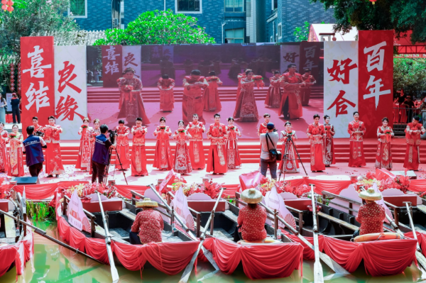 2015年,“南沙水乡婚俗”被列入第五批市级非物质文化遗产保护名录,成为南沙区独特的民俗文化。相较于旧时礼节繁多的水乡婚俗,现在的水乡婚礼既简化传统礼节,保留鲜明的传统文化特色,又融合廉洁家风建设,倡导文明婚俗新风尚,引导新人、亲友和游客在体验岭南水乡魅力的同时,增强对中华优秀传统家风文化的价值认同和自觉传承。