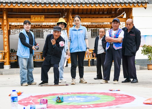 云南省牟定县乐心社会工作服务中心联合银发志愿服务队,为全县7个乡镇敬老院的老人开展关爱服务。图为社工在江坡敬老院和老人一起玩丢沙包游戏。 供图/段绍东