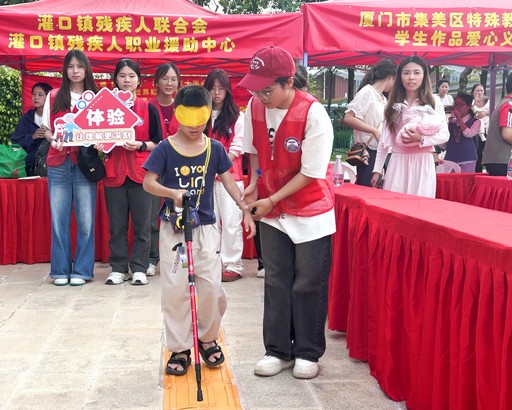 福建省厦门市集美区灌口镇“五社联动”项目社工联合开展助残公益活动。图为一名儿童体验盲道模拟场景,亲身感受残障群体面临的生活挑战。 供图/黄春梅